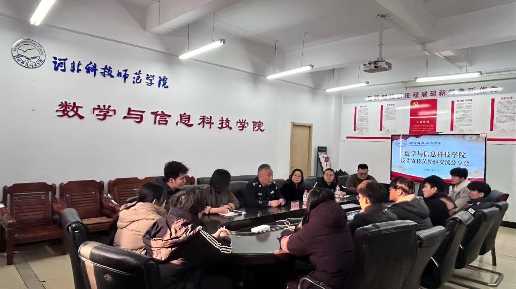 12月10日,数学与信息科技学院反诈宣传员经验交流分享会在逸夫楼A1001召开。本次活动紧密响应秦皇岛市高校反诈先锋志愿服务联盟工作部署,旨在进一步深化校园反诈宣传教育成效,筑牢平安校园防护网。秦皇岛市海港分局王宝军警官、学院学生工作负责同志、全体专职辅导员及10名学生党员反诈宣传员参加分享会。