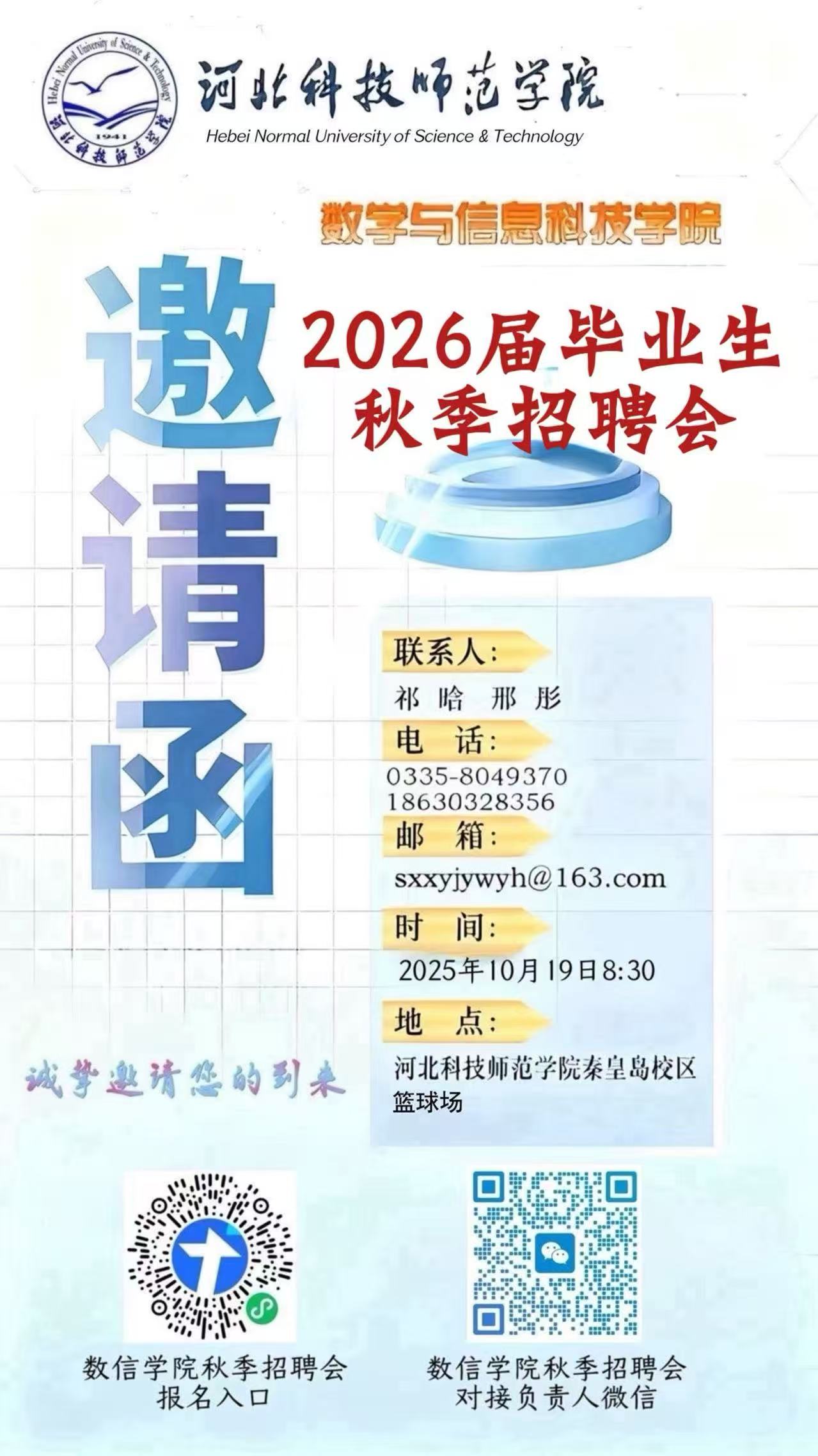 河北科技师范学院2026届毕业生秋季校园招聘会10月19日(周日)上午8点在秦皇岛校区篮球场举办。数信学院向各领域企业发出诚挚邀约---学院2026届毕业生677人,其中研究生29人,本科生648人,涵盖数学与应用数学、计算机科学与技术、网络工程、人工智能、数据科学与大数据技术、物联网工程、应用统计学、数字媒体技术等专业,学生不仅具备扎实的理论功底,同时积累了丰富实践经验。诚挚邀请用人单位来我院选聘人才,扫码即可报名!